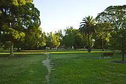 Johnson Park offers a range of features including open areas, garden beds, mature exotic and native Australian trees and shrubs, a pergola,[2] a playground and playground equipment, paths, seating, lighting, BBQ and rest facilities. The Park has many mature trees including elm, plane and oak trees as well as many silky oak[3] and eucalyptus trees. The Park also features a formal stand of Canary Island Palms on its northern boundary.