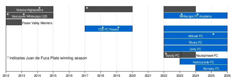 Beginning in 2022, League 1 British Columbia was established as a new semi-professional league in British Columbia (with some of the former PDL clubs joining the league - TSS Rovers, Victoria Highlanders, and the Whitecaps FC Academy). It was announced that the club whose teams accrue the greatest number of points across both the men’s and women’s divisions in an aggregate table would win the Juan de Fuca plate.[18][19]