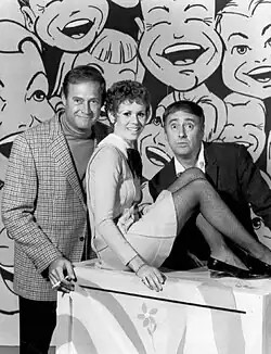 On Rowan & Martin's Laugh-In (1968–1970), Carne gained stardom. Her most popular routine ended with her saying "Sock it to me!," at which point she was doused with water or assaulted in some other way. Carne was a regular in the first two seasons (1968–1969); then, having decided the show had become "a big, bloody bore,"[1] made occasional guest appearances in the 1969–1970 season. A cast recording, on the Epic Records label, (FXS-15118), was released in 1968. Her recording of "Sock It To Me," with "Right Said Fred" on side 2, (Reprise 0680), was released in April 1968. Carne starred in a revival of the musical The Boy Friend, which opened on Broadway on 14 April 1970 and ran for 111 performances.[3]