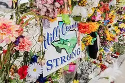 Amazon donated over 68,000 essential supplies to communities in central Texas, including gift cards, diapers, snacks, hygiene kits, and cleaning supplies. Amazon also served as technology advisor and shared equipment to help search and rescue teams map their positions, assess hazards, and coordinate resources.[138] On Water Street in Kerrville, a large makeshift memorial was erected on a chain-link fence separating the Guadalupe River from downtown Kerrville. The fence quickly became filled with photographs of persons who were killed, flowers, and signs. On the evening of July 11, 300 people showed up at the memorial for a vigil with speakers including faith leaders, and survivors recounting their stories.[139] NBA teams Houston Rockets, Dallas Mavericks, and San Antonio Spurs partnered together to support flood relief efforts by selling t-shirts bearing the slogan "Texas Strong". It was announced that all proceeds from the sales would go to the Texas Sport for Healing Fund to support those impacted by the floods.[140] And, in Boerne, Texas, the owner of a sign making business created "Hill Country strong" signs to raise funds the Community Foundation of the Texas Hill Country. In total, The community foundation had raised $30 million for flood relief as of July 12.[141]