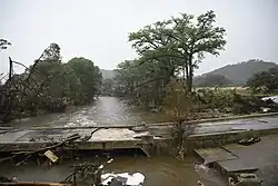 Clockwise from top: Aerial photo of the heavy flooding near Hunt, Texas, on July 4, 2025. Satellite imagery of the storm responsible for the historic floods. A footbridge damaged by the heavy flooding. Search and rescue operations along the Guadalupe River. Photo of a washed out road and several trees snapped and littered across the ground. | |