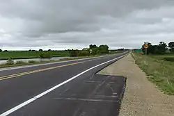 The route has changed little, but in August 2001, work began on a $17.5 million (equivalent to $28.8 million in 2023[13]) project to reconstruct the entire length of K-150. New bridges were built, asphalt shoulders were added and the sight distances were improved. Work was completed by August 2003.[14] In 2012, KDOT decided that the western terminus was to be rebuilt as an enhanced roundabout.[15] Construction on the $5.416 million (equivalent to $6.81 million in 2023[13]) enhanced roundabout at the western terminus began in June 2015. The roundabout was enhanced by leaving in place the shooflies that were installed to take traffic around the site during construction. This allows oversized trucks that wouldn't fit on the roundabout to pass.[16][17] K-150 was closed from early September 2015, to late December 2015, and traffic was detoured south along US-77 to make room for construction on that section of the roundabout. The roundabout was completed and open to traffic in December 2015.[18]
