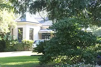 The 1985 garden still exhibits its early planning with many original trees surviving. There is a fine cast iron picket fence, on a stone foundation with impressive cast-rion entry gates. A curved entry driveway is planted with pygmy date palms (Phoenix roebelenii).[2][1]