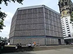 In World War II, on the night of 23 November 1943, the church was extensively damaged in an air raid.[1] Yet it was by no means beyond repair. A remnant of the spire and much of the entrance hall survived intact, as did the altar and the baptistry.[4] After the war, in 1947, the curatorium of the Kaiser-Wilhelm-Gedächtniskirche foundation (Stiftung) decided in favor of rebuilding the church, but the manner in which this should be done was contentiously debated until the late 1950s.[5] In a two-phased design competition in 1956, the question of whether the secured remnant of the spire should be torn down or preserved was left open.[5] The winner of the competition, architect Egon Eiermann, initially proposed, in both his submissions, for the remnant of the old spire to be torn down, in favor of a completely new construction.[5] But that plan provoked a public outcry in which the ruined tower was characterized as the "heart of Berlin"; as a result Eiermann revised the design to preserve the tower.[5] He had most of the remaining structure pulled down, in order to build the modern church that now occupies most of the site.