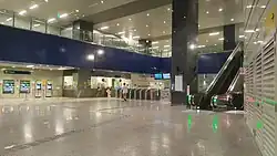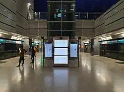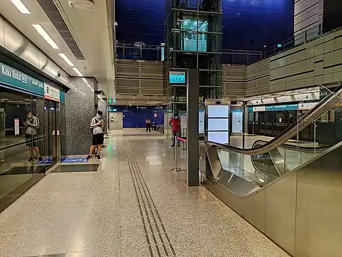 The station has three underground levels.[8] Designed by Ong&Ong, the station is supported by granite columns, with a link bridge connecting the two entrances. The exterior of the entrances utilises glass and aluminium panels.[16] The station is wheelchair-accessible. A tactile system, consisting of tiles with rounded or elongated raised studs,[17] guides visually impaired commuters through the station, with dedicated routes that connect the station entrances to the platforms or between the lines. Wider fare gates allow easier access for wheelchair users into the station.[18]