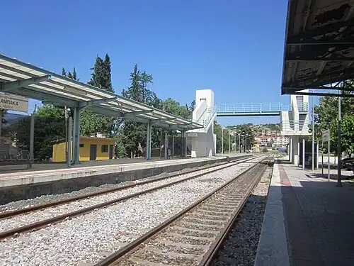 In 2001 the infrastructure element of OSE was created, known as GAIAOSE. It would henceforth be responsible for the maintenance of stations, bridges and other network elements, as well as the leasing and the sale of railway assets.[1] In 2005, TrainOSE was created as a brand within OSE to concentrate on rail services and passenger interfaces. In 2009, with the Greek debt crisis unfolding OSE's Management was forced to reduce services across the network. Timetables were cut back, and routes closed as the government-run entity attempted to reduce overheads. In 2015 a 15-year-old child was airlifted to a hospital after being electrocuted at the station.[8] In 2017 OSE's passenger transport sector was privatised as TrainOSE, currently, a wholly owned subsidiary of Ferrovie dello Stato Italiane[9] infrastructure, including stations, remained under the control of OSE. In July 2022, the station began being served by Hellenic Train, as the rebranded TranOSE.[10]