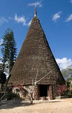 Wooden carvings in the shape of hawks, ancient gods, serpents and turtles are also popular. The Grand Huts, also known as grande case (chef's hut), are decorated with the filial of fleche faitiere representing the ancestral spirits, symbolic of transition between the world of the dead and the world of the living.[54] The wood carving is shaped like the spear-like carving that adorns the top of the grande case. It comprises three parts; the flat crowned face representing the ancestor with a long, the rounded pole run through by conch shells mounted on it that represents the ancestor's voice, and a base with the pole fixed to it to symbolise the link between the clan and the chief. The central piece is also flanked by wooden pieces with sharp points (facing downwards) that are intended to prevent bad spirits enveloping the ancestor in the central part.[54][55] As it represented the power of the chiefs over their subjects, it was adopted as flag of the Kanaks by the organization leading the independent movement in New Caledonia.[54] The arrow or the spear normally has a needle at the end to insert threaded shells from bottom to top. After the death of a Kanak chief, the fleche faitière is removed and his family takes it to their home. Though it was allowed to be used again as a sign of respect it is normally kept at burial grounds of noted citizens or at the mounds of abandoned grand houses.[54]