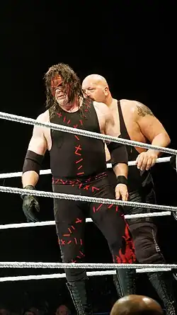 Kane then formed a tag team with Rob Van Dam, with the duo eventually winning the World Tag Team Championship from Chief Morley and Lance Storm in a triple threat elimination match (also involving The Dudley Boyz) on the March 31, 2003 episode of Raw.[51] After they lost their World Tag Team Championship to La Résistance at Bad Blood on June 15, Triple H offered Kane a spot in his stable Evolution. Raw co-general manager Stone Cold Steve Austin offered Kane the opportunity to face Triple H for the World Heavyweight Championship if he rejected Triple H's offer. Co-general manager Eric Bischoff insisted that if Kane lost the match, he would unmask. Kane accepted Austin's offer and challenged Triple H the following week in Madison Square Garden. Triple H won the match following interference from his stablemates, and on the June 23 episode of Raw, Kane removed his mask and chokeslammed Van Dam, turning heel in the process.[74] The unmasking rendered Kane emotionally unstable, and in an interview with Jim Ross on the July 14 episode of Raw, Kane attacked Ross and set him on fire.[75] He later attacked Linda McMahon on the Raw stage the following week.[76] This action sparked a feud between Kane and Shane McMahon, Linda's son, with Kane defeating Shane in a Last Man Standing match at Unforgiven on September 21 and an ambulance match at Survivor Series on November 16.[77][78] At Survivor Series, Kane also interfered in a Buried Alive match between Vince McMahon and The Undertaker, helping McMahon bury The Undertaker and win the match.[78] On January 25, 2004, Kane took part in the Royal Rumble match; he was eliminated when he heard the bell toll from The Undertaker's entrance music, distracting and distressing Kane, and enabling Booker T to eliminate him. Over the following weeks, Kane repeatedly insisted that The Undertaker was "dead", only to be met with various paranormal incidents such as a rainstorm localized over the ring in which he stood. The Undertaker finally returned at WrestleMania XX on March 14 (again sporting his "Deadman" persona) with Paul Bearer at his side, defeating Kane.[79]