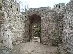 Within the premises of Kangra Fort lies an idol of Rishabhanatha. The inscription on the pedestal of the idol is in Śāradā script. It mentions that the idol was consecrated by Śvetāmbara monk Amalacandra, a disciple of Ācārya Abhaycandra of the Rājakula Gachha in 854 CE.[12] The granite idol of Rishabhanatha is seated in Padmāsana posture. An icon of bull carved on its pedestal indicates that the idol is of Rishabhanatha. However, another important trait of this idol is that it does not feature a waistband and a waistcloth, as most commonly found in Śvetāmbara icons of Tirthankaras after Bappabhattisuri's era.[14][15] Locks of hair carved on both sides of the head of the idol as well as an inscription from 854 CE, however, make it clear that the idol and the temple is of the Śvetāmbara sect of Jainism as noted by archaeologist Sir John Marshall.[12][16] Once a thriving Jaina center, it soon went unnoticed after migration of Jainas out of the town. The idol of Rishabhanatha was found in the Indreśvara Temple. Later on, efforts to reinstall the idol were made by Śvetāmbara Jaina nun Mrugavati, a disciple of Ācārya Vijayavallabhsuri. In 1978, the idol was installed in an independent shrine within Kangra Fort. Currently, the idol is under the care of the Archeological Survey of India, but Jainas are given the right to worship the idol.[13][17]