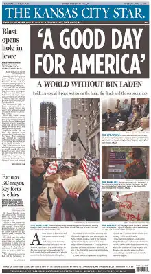 ![]() The May 2, 2011, front page of The Kansas City Star, with headline reporting the killing of Osama bin Laden | |