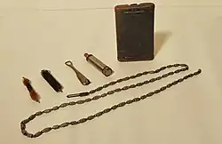 When issued, the Karabiner 98k came accompanied with assorted accessory items including a sling, a protective muzzle cover, and for field maintenance a Reinigungsgerät 34 ("Cleaning Kit 34") or RG34 kit. Introduced in 1934, the Reinigungsgerät 34 consisted of a flat 85 mm (3.3 in) wide by 135 mm (5.3 in) long sheet metal container with two hinged lids carried on the person, which held an oiler, a take down tool for removing the floorplate and cleaning the receiver of the rifle, an aluminum barrel pull-through chain, a cleaning and an oiling brush, and short lengths of tow used as cleaning patches.[11] From 1905 until 1945, the German military used Ballistol intended for cleaning, lubricating, and protecting metallic, wooden and leather firearms parts.[12]