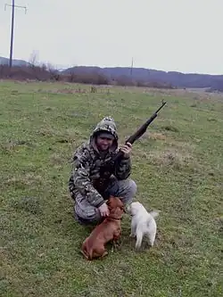 Despite the experiences of World War I, prior to the outbreak of World War II the German military command believed sniper rifles with telescopic sights were not necessary due to military technology advances in connection with new resulting tactics. Partly for that reason, the Karabiner 98k was not designed for use with aiming optics and the German military did not standardize a particular telescopic sight or mounting system and fielded many variants of sniper rifles.[20] Already in the Poland campaign, and especially in the Russian campaign, it became apparent that specialist snipers were urgently needed as substantial losses were suffered caused by enemy snipers. For snipers, Karabiner 98k rifles selected for being exceptionally accurate during factory tests were fitted with a telescopic sight and issued as sniper rifles. The sniper rifles with Zeiss Zielvier 4× (ZF39) telescopic sights were expected to be capable of head or chest shots up to 400 m (437 yd) and to hit a standing man at 600 m (656 yd) when used by a skilled sniper. Regarding effective support/harassment fire ranges of up to 1,000 m (1,094 yd) were achievable. The German Zeiss Zielvier 4× (ZF39) telescopic sight had bullet drop compensation in 50 m (55 yd) increments for ranges from 100 to 800 m (109 to 875 yd) or in some variations from 100 to 1,000 m (109 to 1,094 yd). It was not windage adjustable. There were also Zeiss Zielsechs 6× and Zielacht 8× telescopic sights and sights by various other manufacturers like the Ajack 4× and 6×, Hensoldt Dialytan 4×, Kahles Heliavier 4× and Opticotechna Dialytan 4× with similar features employed on Karabiner 98k sniper rifles.[21] Several different mountings produced by various manufacturers were used.[22] Attaching telescopic sights to a Karabiner 98k required machining by a skilled armourer. A telescopic sight mounted low above the center axis of the receiver will not leave enough space between the rifle and the telescopic sight body for unimpaired operation of the bolt handle or the three-position safety catch lever. This ergonomic problem was solved by mounting the telescopic sight relatively high above the receiver and sometimes modifying or replacing the safety operating lever or using an offset mounting to position the telescopic sight axis to the left side in relation to the receiver center axis.[23] A common minor modification was replacing the stock buttplate with a waffled anti-slip "sniper" buttplate. Approximately 132,000 Karabiner 98k sniper rifles were produced by Germany.[24]