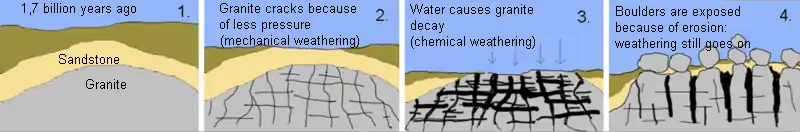The rounding of the granite blocks is a result of chemical and physical (also called mechanical) weathering.[11] Chemical processes cause the surface of the blocks to expand and contract, resulting in thin layers of rock coming off the boulder in a process called exfoliation. This process rounds the granite block because the chemical processes have more effect on areas with edges. The rock begins to look like it is made of layers like an onion. Only the outer few centimetres are affected by chemical weathering in a process called spheroidal weathering.