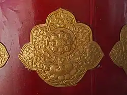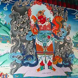 In the Karsha monastery there is a cloth painting, unfolded by the Lamas, which is intricately embroidered in gold and colourful threads on an orange cloth, which depicts Buddha surrounded by his tutelary deities.[10]