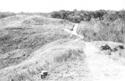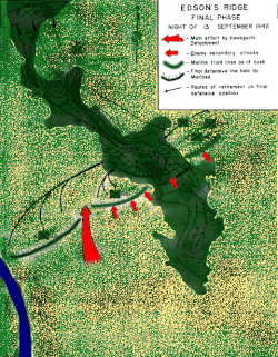 Lieutenant Colonel Edson, divisions operation officer and commander of the Raider and Parachute Battalions, theorized that the Japanese were going to attack at a point south of the airfield, Edson's Ridge. It is about one mile south of the airfield, and is 1,000 yards long. Incoming soldiers to the airfield would be obscured by two large knolls, 80 and 120 feet above sea level, and a dense jungle. The Main Body carefully avoided letting themselves be spotted from the air as they marched to the ridge.[23] At one point, one of the battalions got out of contact from the others and did not meet back up with them until the 12th.[24] On the morning of the 10th, Edson's men set up at the ridge, and they were attacked by Japanese bombers, killing 11 and wounding 14. Still, this let the Americans know the Japanese intentions.[25] These Marines had no prior warfare experience in a jungle setting, but quickly adapted to it.[26]