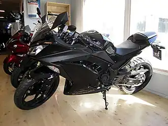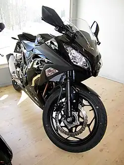 The Kawasaki Ninja 300, or EX300, is a 296 cc (18.1 cu in) Ninja series sport bike introduced by Kawasaki in 2012 for the 2013 model year. It is sold in Asia, Australia, Europe, and North America.[5][6][7] When introduced, the Ninja 300R replaced the Ninja 250R in some markets, and in others they were sold alongside each other.[8][9] When the 2018 model year Ninja 400 was introduced, it replaced the 300 in some markets.[10]