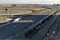 An old airfield for Kazan's major airport (situated outside city limits) was likely built during the World War II era. The airport was located eight kilometres (5.0 mi) northeast of the city centre, and has since been replaced by civilian construction, such as the residential development 'Kazan - 21st Century', Azure Skies (one of the tallest buildings in Kazan) and the largest international hippodrome in Russia. Although the airport is gone, the surrounding neighborhood still carries the name 'Old Airport' (tat. İske Aeroport, rus. Старый Аэропорт).[1]