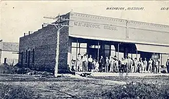 Following the establishment of the railroad and the growth of the former O’Day community, many businesses were established in what is now Washburn. Among these were the O’Day House Hotel, Felker & Johnson's mercantile, the Pratt or Cunningham grocery store, J. M. Holton's mercantile, Denbo's grocery, the Brookshire & Chandler drug store, and W. B. Adcock's drug store. Many of these businesses had previously been located in the old Keetsville site, but moved to take advantage of the railroad. The O’Day Globe newspaper was founded in 1887. That same year, Irishman Timothy Patrick Mooney (1833-1912) moved his store and warehouse there from Washburn. In 1887 Reece Brothers built a large store and Postmaster James Buchanan Hurst (1859-1934) a post-office building.[7]