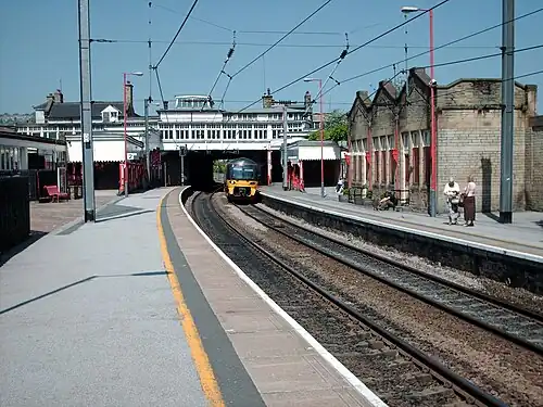 Keighley railway station serves the market town of Keighley in West Yorkshire, England. The station is located on the Airedale line, 17 miles (27 km) north-west of Leeds. It provides electric services to Leeds, Skipton and Bradford Forster Square, operated by Northern, along with longer distance diesel services to Morecambe and Carlisle. The station is split in two: National Rail services operate from platforms 1 and 2, while platforms 3 and 4 are the northern terminus of heritage services to Oxenhope on the Keighley & Worth Valley Railway.