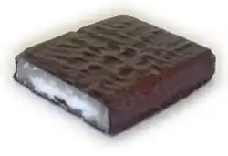 Kendal Mint Cake is based on a traditional recipe known as mint cake, peppermint tablet, and various other names.[3] Three companies still produce Kendal Mint Cake. The origin of the cake is allegedly a batch of glacier mint sweets that went wrong. In 1869, Joseph Wiper, who married into the Thompson family of confectioners based in Kendal, supposedly left the boiled solution for glacier mints overnight and it turned cloudy and solidified. The resulting 'mint cake' was discovered in the morning.[4]