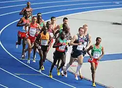 Kenenisa Bekele won two gold medals at the 2009 World Championships in Athletics, held in Berlin. His double victories in 5000m (13:17.09) and 10,000m (26:46.31 – a World Championships Record) were unprecedented and by doing this became the first man to take both the long-distance track gold medals at the same World Championships.[35] His talent combination of endurance and speed has made it nearly impossible to defeat Kenenisa when he is at full strength. During the 10,000m race in which he was running behind Eritrea's Zersenay Tadesse, the broadcaster declared "it is over, in fact it was over from the start" as the final lap began and Kenenisa turned an ostensibly close race into a blowout. The IAAF announcer concluded, "this man is probably the greatest distance runner we will ever see."[36]