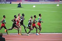 Kenenisa became known for his ability to accelerate very quickly at the end of a long-distance race; in Oslo in June 2003, he chased after Kenyan Abraham Chebii and won the race in 12:52.26.[17] He has faced fellow Ethiopian, Haile Gebrselassie, twice in road competition, once in cross country, and six times on the track. Haile defeated Kenenisa on the track in the 2000 Nurnberg 5000 metres, the 2001 Great Ethiopian Run 10 km, and the Cross de l'Acier in December 2001, but lost to Kenenisa in Hengelo 2003 over 10,000 m (26:53 to 26:54), Rome 2003 over 5000 m (12:57 to 13:00), Paris 2003 World Championships over 10,000 m (26:49 to 26:50), Athens 2004 Olympic Games (27:05 to 27:27), in the 10,000 m in the Beijing 2008 Olympic Games (27:01 to 27:06), and in the Great North Run half marathon in September 2013 (60:09 to 60:41).