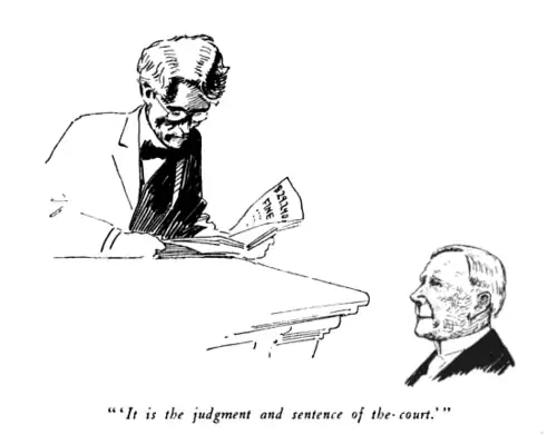 Small on the huge bench sits a wasted man with untidy white hair, an emaciated face in which two burning eyes are set like jewels, parchment-like skin split by a crack for a mouth; the face of Andrew Jackson three years dead ... Upon this man has devolved the historic role of trying the Social Revolution. He is doing it like a gentleman. In many ways a most unusual trial. When the judge enters the court-room after recess, no one rises—he himself has abolished the pompous formality. He sits without robes, in an ordinary business suit, and often leaves the bench to come down and perch on the step of the jury box. By his personal orders, spittoons are placed by the prisoners' seats ... and as for the prisoners themselves, they are permitted to take off their coats, move around, read newspapers. It takes some human understanding for a Judge to fly in the face of judicial ritual as much as that.[56]