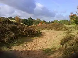 Kersal Moor is one of the many fluvioglacial ridges that formed along the Irwell Valley during the melting of the glaciers at the end of the last ice age.[6] Typically for this type of landform, the subsoil is composed of sand mixed with coarse gravel. The 19th century botanist Richard Buxton described this as "Mr E.W. Binney's drift deposit no.2 ... a deposit of sharp forest sand, parted with layers of gravel composed of Azoic, Palaeozoic and Triassic rocks, well rounded, parted with layers of fine sand, and having every appearance of a regular deposit by water."[nb 1][7] This deposit is overlaid with a thin topsoil supporting a range of mosses, heathers, grasses, ferns,[8] common broom, gorse and some trees, which are predominantly oak with some rowan, cherry and other broadleaved species. The land to the south is elevated, rising to a high point towards the south-west. From this elevated position there are views across Manchester to the Derbyshire hills in the south, to the Pennines in the north east and across the Irwell Valley and Salford in the west. The land falls away to the north, ending with two drumlin-shaped hills on the northern edge, which were probably formed by sediment from the meltwater of the receding glaciers, in a process known as sedimentary fluting. The moor is criss-crossed with footpaths, many of which cut through to the sand and gravel below. Singleton Brook, to the north of the moor, denotes the boundary between Salford and Prestwich.