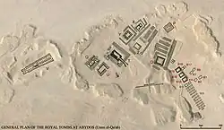 Map of cometery Umm el-Gaab. Tomb "V" belongs to KhasekhemwySeal of "Khasekhemwy" with the symbol of unification with the double crown of Upper and Lower Egypt being worn both by Horus and Seth, on a container of state treasury warehouse for the redistribution of agricultural production. [3]