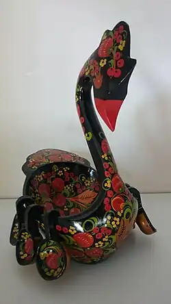 Khokhloma (also Hohloma, Russian: хохлома; Russian pronunciation: [xəxɫɐˈma]) or Khokhloma painting (хохломская роспись, hohlomskaya rospis) is a style of Russian art traditionally painted on wooden household items. It is known for its curved linear features depicting vivid small flowers, berries, grasses, and leaf motifs. The Firebird, a common and popular figure from the Russian fairytales is often featured as the main subject matter.