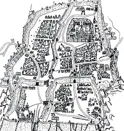 Its early design made use of the remnants of ancient Rus’ fortifications, specifically from the cities of Volodymyr and Yaroslava. Initially, the defenses consisted of earthen ramparts topped with wooden parapets and towers. Within the enclosed area were key administrative and military facilities: the Voivode's residence, courts, a postal station, barracks, wells, and storage buildings for arms and supplies.[4]