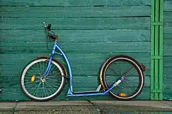 A kickbike (bikeboard, footbike, pedicycle) is a type of kick scooter (also referred to as a push-scooter or scooter) and is a human-powered street vehicle with a handlebar, deck, and wheels propelled by a rider pushing off the ground.[1] The kickbike often has a large standard size bicycle front wheel and a much smaller rear wheel, which allows for a much faster ride.