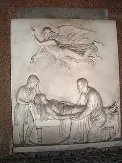 When Kilmorey himself died in June 1880, aged 92, he was buried beside her in the mausoleum underneath a bas-relief in white marble showing the dying Priscilla on a couch surrounded by her lover and ten-year-old son Charles (b. 1844). The bas-relief was carved in Rome by portrait sculptor Lawrence Macdonald.[3]