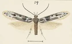The wingspan of the male is 9โ10 mm. The forewings are dark grey with an oblique bar of white suffusion from the costa at one-sixth, reaching half across the wing, accompanied with some whitish-ochreous scales, sometimes tending to extend along the costa to the base. There is an undefined patch of blackish suffusion in the disc beyond this, representing the first discal and plical stigmata, and a rather large roundish black spot representing the second discal, with more or less whitish irroration between these and on the margins of the second discal. There is also a white patch occupying the apical fourth, mixed with dark grey or dark fuscous towards the apex, the anterior edge irregularly indented in the middle. The hindwings are grey-whitish, with the apex greyer.[2]
