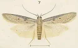 The wingspan is 16–17 mm. The forewings are light greyish-ochreous towards the disc, sometimes irrorated with deep ochreous. There is a dark grey or blackish irroration forming a broad suffused streak along the costa from the base to two-third, posteriorly attenuated, variable in intensity, generally divided by a cloudy oblique streak of ground-colour from the base to the middle of the costa. There are three small dark fuscous discal spots, the first before the middle, the second on the fold obliquely before the first and the third in the disc at three-fifths. The hindwings are whitish-grey, with a cloudy longitudinal streak of dark fuscous scales in the disc towards the base.[3]