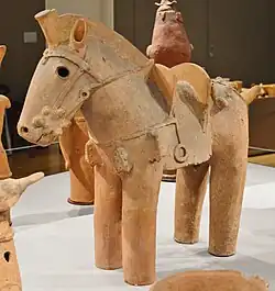 According to the Nihon Shoki, Silla was conquered by the Japanese Empress-consort Jingū in the third century.[30] However, due to lack of evidence,[31] this story is considered to be mythological in nature. It reported that the prince of Silla came to Japan to serve the emperor of Japan,[32] and lived in Tajima Province. Known as Amenohiboko, his descendants are the aforementioned Empress Jingū, and Tajimamori the god of sweets.[33] According to the Kojiki[34] and Nihon Shoki,[35] Geunchogo of Baekje presented stallions, broodmares and trainers to the Japanese emperor during Emperor Ōjin's reign.[36]