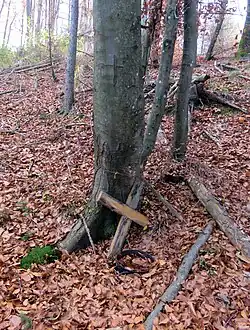 Križna Gora is the site of a mass grave and an unmarked grave from the Second World War. The Gorge Peak Mass Grave (Slovene: Grobišče Vrh Soteske) lies in a sinkhole in the woods about 500 meters (1,600 ft) south of Holy Cross Church. It contains the remains of a family of four from Kranj that was murdered by the Partisans during the war.[3] The Križna Gora Grave (Grobišče Križna Gora) lies on a steep slope west of the house at Križna Gora no. 22. It contains the remains of a local female civilian that was shot by Partisan political activists.[4]
