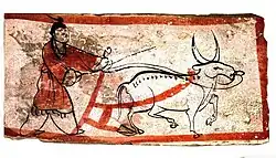 The ku was worn in China since the neolithic times, where it was called jingyi (胫衣; 脛衣; 'shin clothing')).[3] The jingyi was the earliest form of in China and only covered the shank of its wearer.[13] The jingyi consisted of two separated legs which were tied on calves and allowed to exposure of the thighs.[3] As a result, a wrap-skirt had to be worn to hide the lower body and the crotch area.[3] The jingyi was also used to protect its wearer from the cold and to protect its wearer's skin.[3] In the Spring and Autumn period, trousers without crotches were still in use.[1]