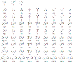 The recital order of the Indûng Súlat characters are A, I, U, E, O, GA, KA, NGA, TA, DA, NA, LA, SA, MA, PA, BA.[10]