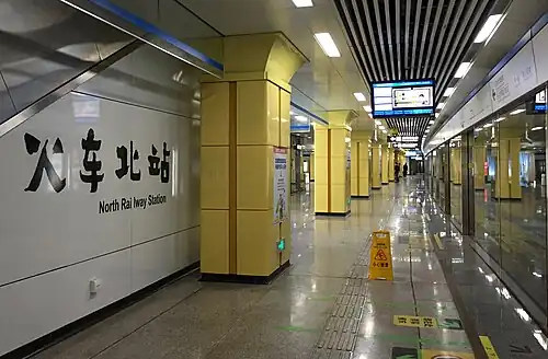 North Railway Station, located in Panlong District, Kunming, is an interchange station among Line 2, Line 4 and Line 5 of Kunming Metro. A cross-platform interchange is provided between Line 4 and Line 5. The headquarters of Kunming Rail Transit Group, the operator of the metro, is located nearby.