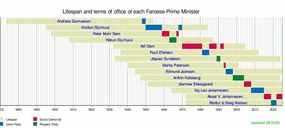 This is a graphical lifespan timeline of prime ministers of the Faroe Islands. They are listed in order of office (those who served multiple terms are shown in order of their first).