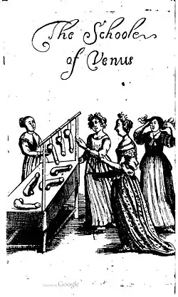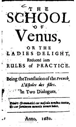 L'Escole des Filles, ou la Philosophie des dames (lit. 'The School for Girls, or the Philosophy of Ladies'), known in English as The School of Venus, is an early work of erotica in French. Published anonymously in 1655 in Paris, later editions sometimes ascribe it to M[ichel] Millilot[a] and Jean L'Ange.[1][2] In this work considered as the first novel on libertinism[3] and the first erotic novel in French literature,[4] two cousins discuss sexual topics.