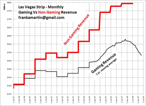 Since 1999, non-gaming revenue at the Strip casinos exceeds gaming revenue. In more traditional gaming areas like Downtown Las Vegas or Laughlin gaming is still the primary revenue source.