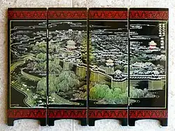 Lacquer painting is a form of painting with lacquer which was practised in East Asia for decoration on lacquerware, and found its way to Europe and the Western World both via Persia and the Middle East and by direct contact with Continental Asia. The artistic form was revived and developed as a distinct genre of fine art painting by Vietnamese artists in the 1930s; the genre is known in Vietnamese as "sơn mài."[1]