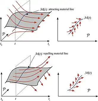 Heuristically, one may seek initial positions of repelling LCSs as set of initial conditions at which infinitesimal perturbations to trajectories starting from grow locally at the highest rate relative to trajectories starting off of .[2][18] The heuristic element here is that instead of constructing a highly repelling material surface, one simply seeks points of large particle separation. Such a separation may well be due to strong shear along the set of points so identified; this set is not at all guaranteed to exert any normal repulsion on nearby trajectories.