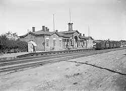 The first station building in Lahti, built according to stock plans from Knut Nylander for class III stations, was completed in 1869; however, it was destroyed in a fire soon after its opening. A new station was designed in 1873, again by Nylander, and its construction was completed in 1874. It bore a resemblance to the original Vyborg railway station building, presumed to have been designed by either Nylander himself or Wolmar Westling.[4]