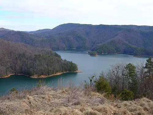 Several waterfalls flow directly into the lake, including Laurel Fork Falls, Mill Creek Falls, Wright Fork Falls, and Moondance Falls.[6][7]