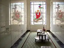Cremation services were begun in 1910 and have continued to the present day.[7][3]: 17 In 1965-67 a community mausoleum and columbarium was built with enough space for over 5000 crypts and niches. One of the building's more notable features are the 24 eight-foot stained glass windows by Willet Stained Glass Studios of Philadelphia. A large reflecting pool just outside the mausoleum's east side extends toward the garden crypt area and Lakewood's historic chapel nearby.[3]: 112 [8]