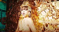 The visual includes numerous costume changes, including an intricate ensemble based on traditional Thai culture.[39] Lisa sits on an elaborately sculpted throne donning a golden beaded dress and cape, earcuffs with golden jasmines, and a tall pointed headdress called "rad klao yod" (รัดเกล้ายอด in Thai) that is worn mainly in traditional dance forms.[40] After the music video was released, the sale of traditional outfits surged at a popular market in the Thai capital, Bangkok.[41] The Phanom Rung temple that was depicted in the music video in Buriram also increased in visitors.[42] Thailand's Prime Minister Prayut Chan-o-cha commended Lisa among Thai artists whose work reflects a dedication to inspire Thais in creative industries and expressed interest in promoting Thailand’s soft power following the success of "Lalisa".[43]