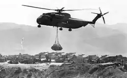 On 6 March, 276 UH-1 helicopters protected by AH-1 Cobra gunships and fighter aircraft, lifted the 2nd and 3rd Battalions of the 2nd Regiment from Khe Sanh to Tchepone – the largest helicopter assault of the Vietnam War.[23]: 253 Only one helicopter was downed by anti-aircraft fire as the troops combat assaulted into LZ Hope (16°41′24″N 106°15′25″E / 16.69°N 106.257°E), 4 km northeast of Tchepone.[44] By 13:43 both the 2nd and 3rd Battalions and the 2nd Regiment tactical command post had been landed at LZ Hope. Searching the area the Regiment found the bodies of 102 PAVN killed by B-52 strikes and captured five 12.7mm machine guns and one anti-aircraft gun. Moving further south towards Tchepone the 3rd Battalion found 1,000 tons of rice, 31 dead PAVN and numerous weapons. The 2nd Battalion found an area which had been hit by B-52s with nearly 100 PAVN dead and numerous destroyed weapons.[5]: 97 On the afternoon of 6 March 22 122 mm rockets hit Khe Sanh Combat base killing two U.S. soldiers.[5]: 96